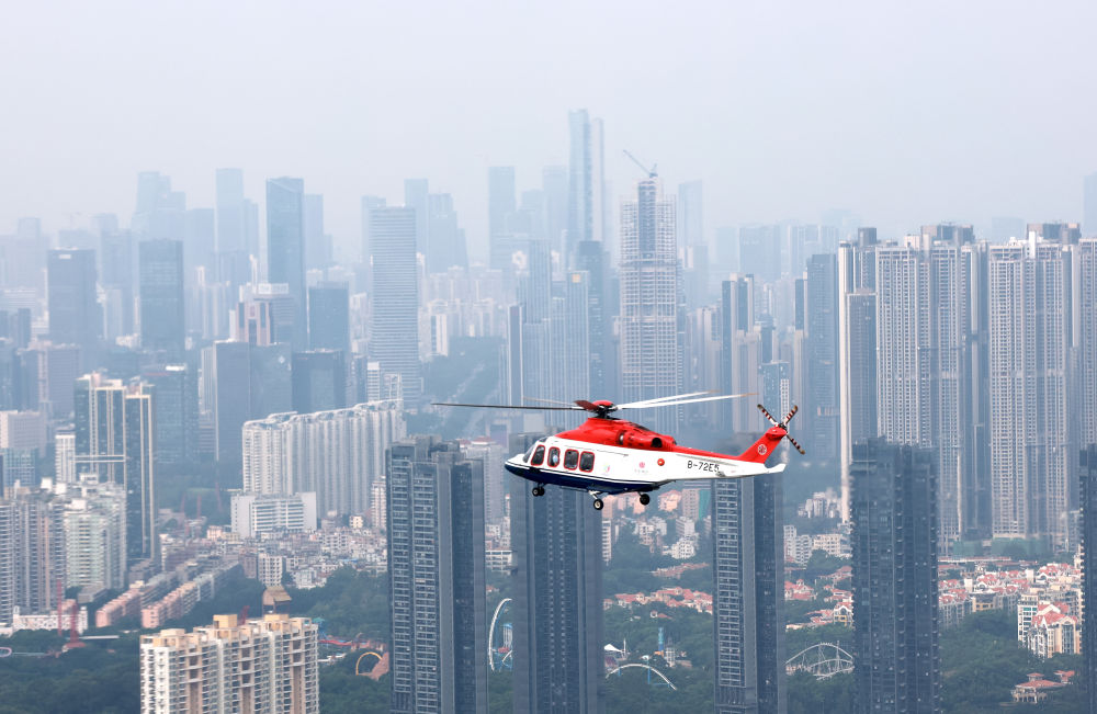 ↑搭载圣火的直升机进行空中传递。新华社记者 梁旭 摄