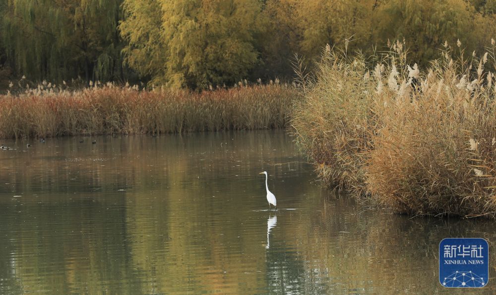 ↑ 11月5日,一只白鹭在甘肃省张掖市国家湿地公园觅食。新华社发(陈礼摄)