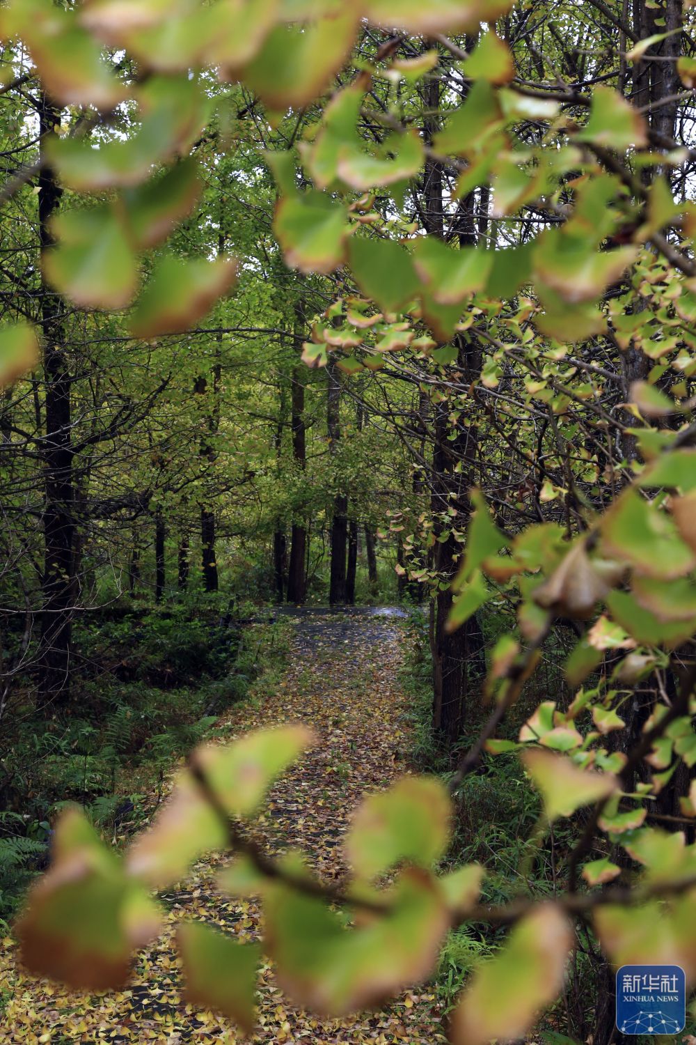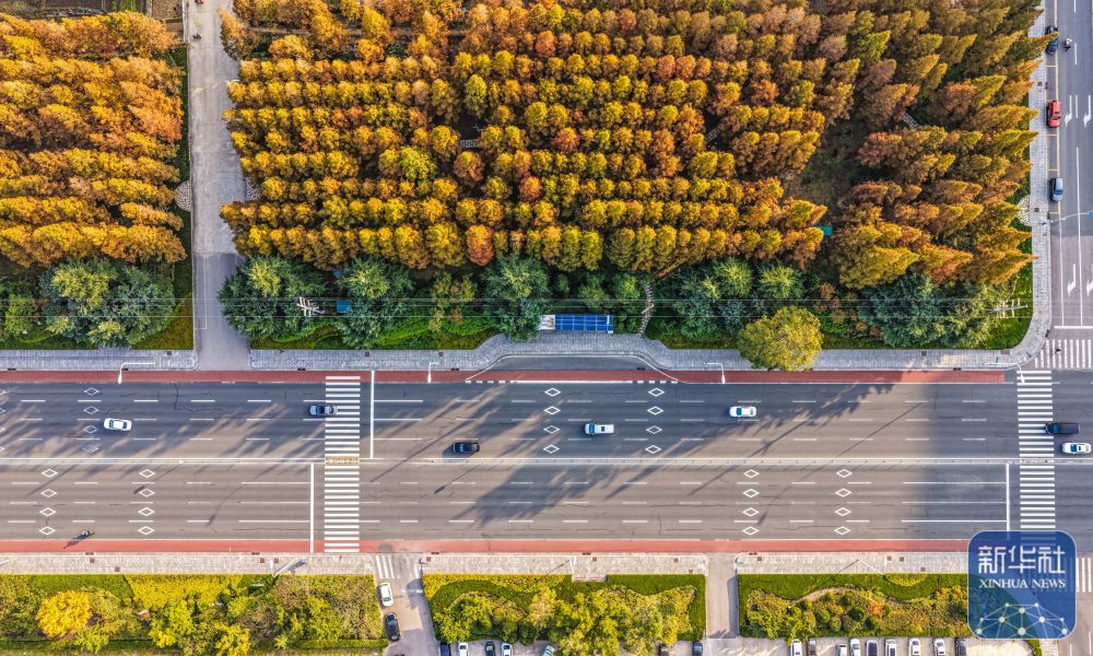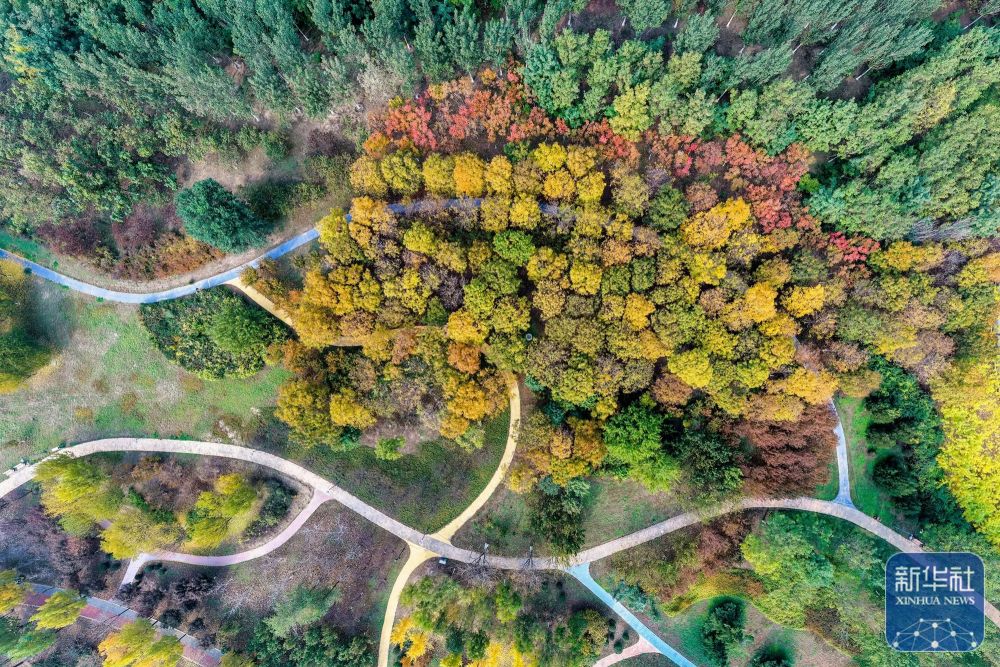↑ 11月5日,在山东省青岛市城阳区棘洪滩街道,林木色彩交织、秋意正浓。新华社发(王海滨 摄)