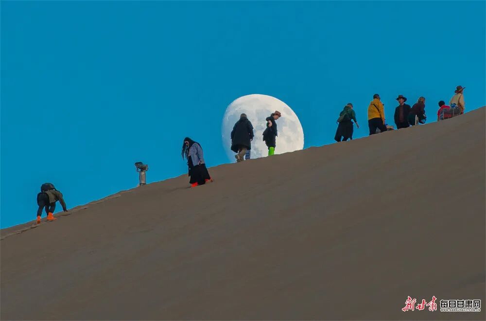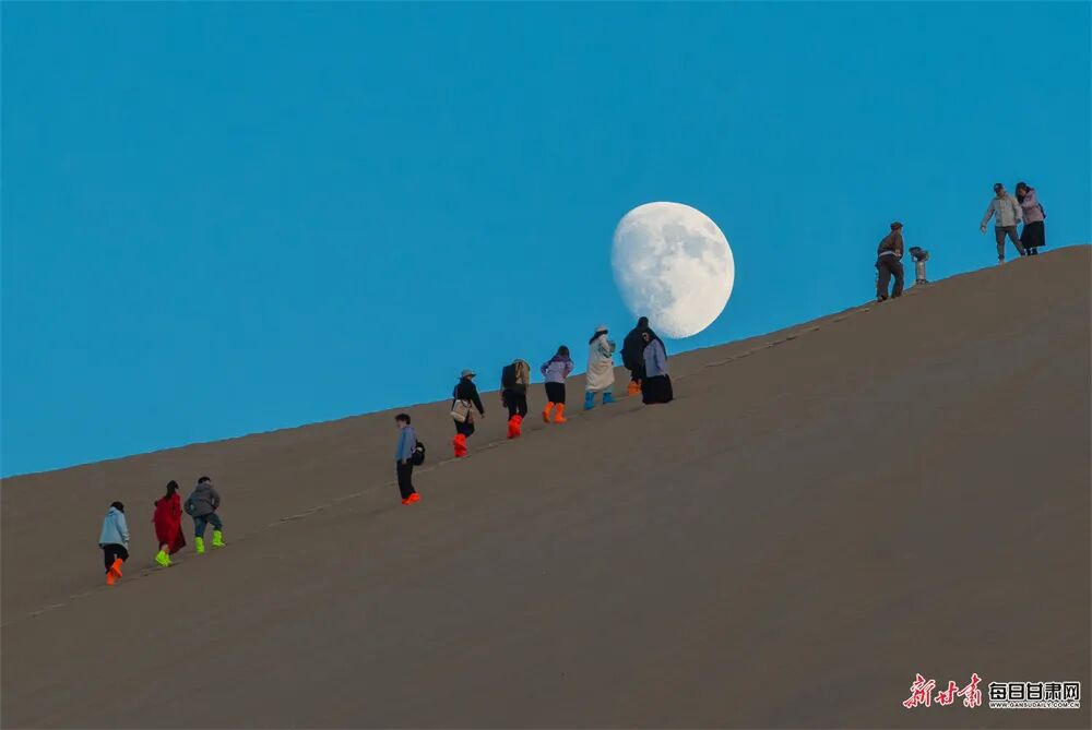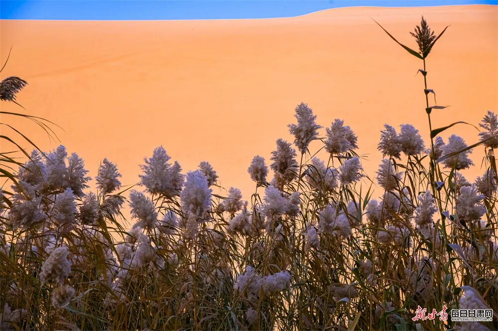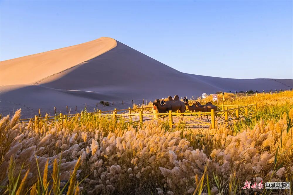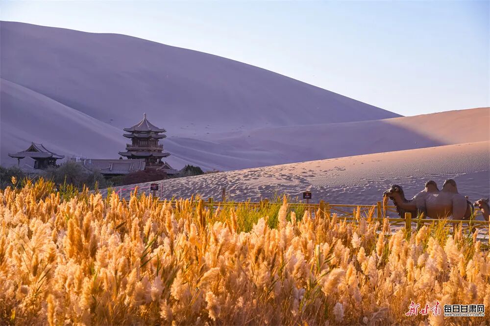 晚秋时节,敦煌鸣沙山月牙泉景区秋色愈浓。浩瀚大漠被夕阳镀上金边,千年胡杨褪去翠绿尽染金黄,湖边芦苇随风摇曳泛起白浪,驼队踏沙而行,清脆驼铃在沙丘间回荡。这幅兼具苍茫与柔美的塞上秋景,连日来吸引大批中外游客驻足观赏、拍照留念,沉浸式感受敦煌大漠的独特魅力。