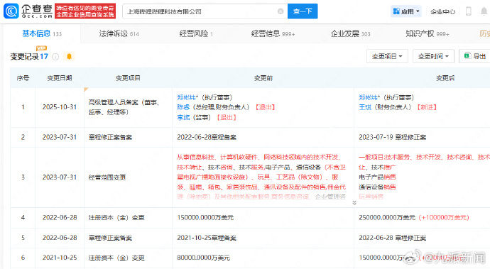 据九派新闻,企查查APP显示,近日,上海哔哩哔哩科技有限公司发生工商变更,陈睿卸任总经理、财务负责人职务。