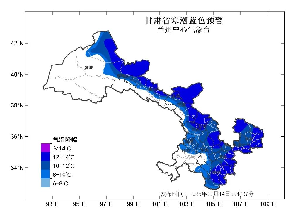 兰州中心气象台2025年11月14日11时37分发布寒潮蓝色预警:预计未来72小时,除酒泉市西南部、甘南高原外,全省大部气温累积降幅将超过8-10℃,其中,河西偏北地区及陇中偏北地区和陇东、陇南地区的大部分地方有寒潮,气温累积降幅可达12-14℃。请注意防范!