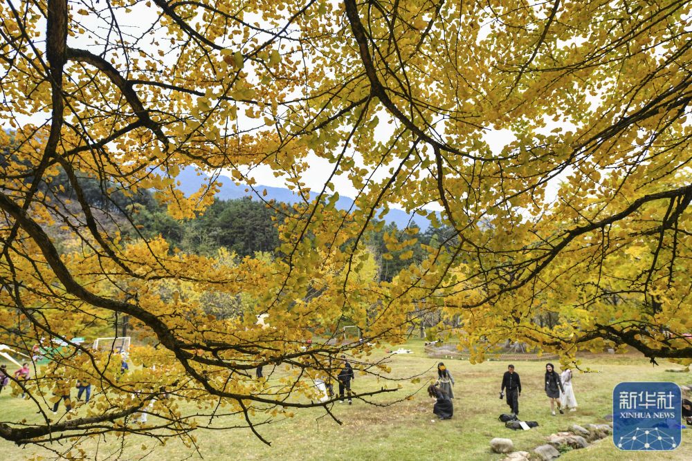 ↑ 11月14日,游人在湖南省永州市双牌县茶林镇桐子坳村古银杏林赏景游玩。新华社发(周秀鱼春摄)