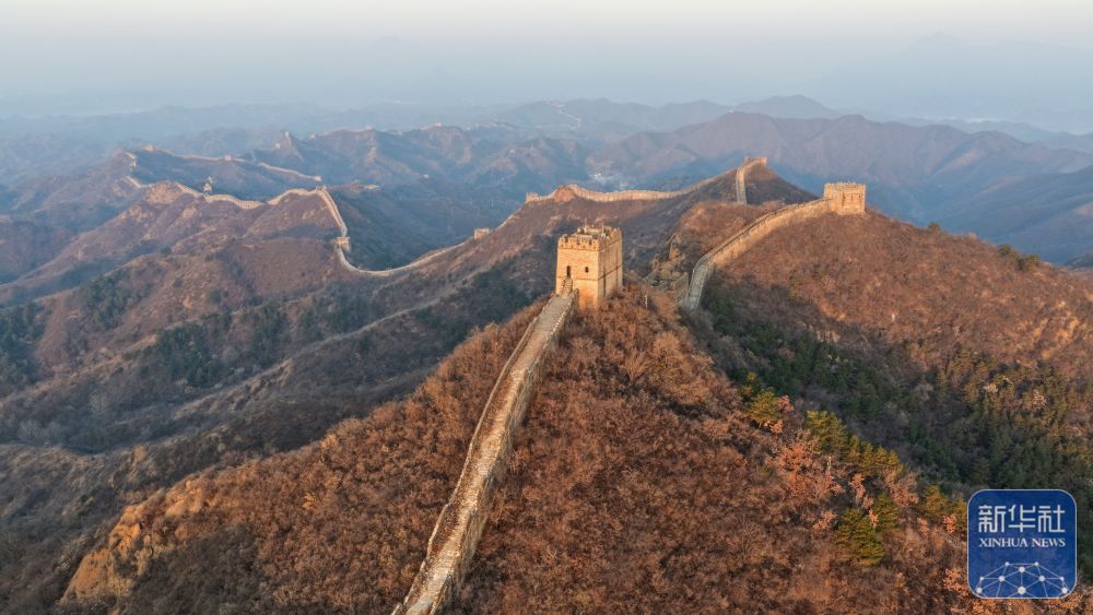 ↑ 11月15日拍摄的晨光映照下的河北省承德市滦平县金山岭长城(无人机照片)。新华社发(周万平摄)