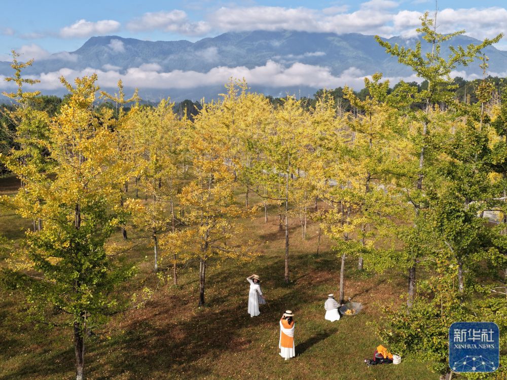 ↑ 11月15日,游人在云南省腾冲市固东镇江东村的银杏林游玩(无人机照片)。新华社发(龚祖金摄)
