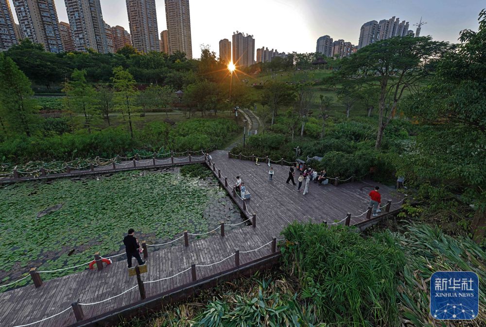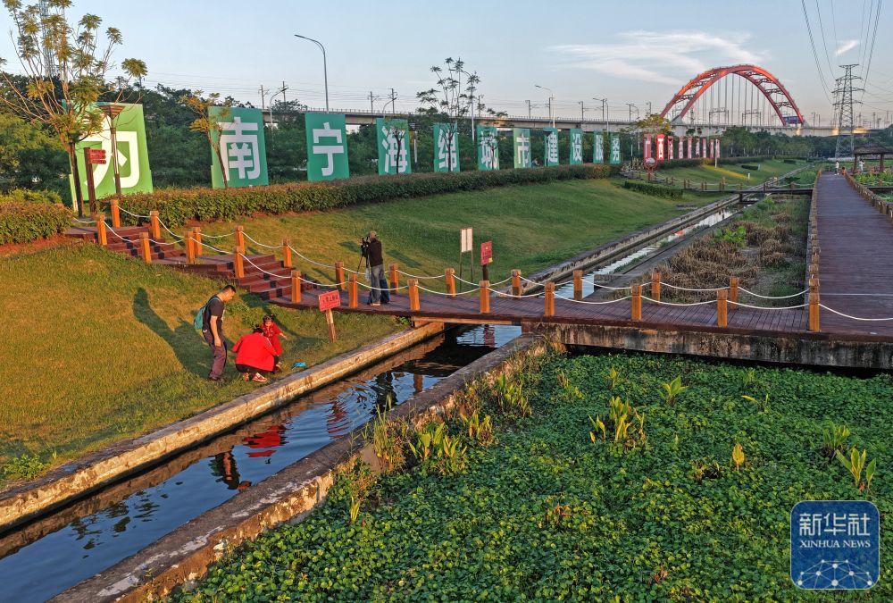 ↑ 市民在广西南宁市那考河湿地公园游玩(11月14日摄,无人机照片)。新华社记者 周华 摄