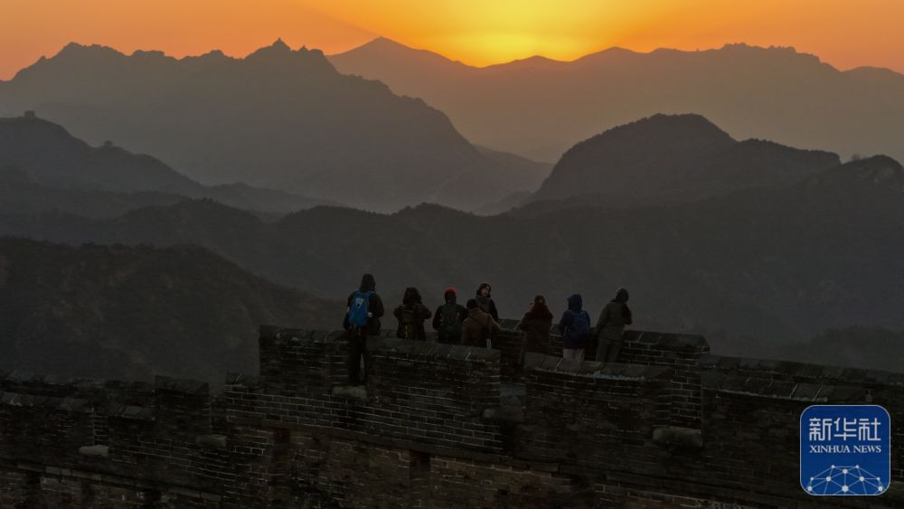 ↑ 11月15日清晨,游人在河北省承德市滦平县金山岭长城观看日出(无人机照片)。新华社发(周万平摄)