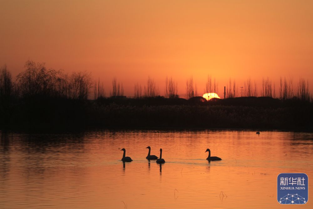 ↑ 11月14日,几只大天鹅在甘肃张掖国家湿地公园水面游弋。新华社发(陈礼摄)