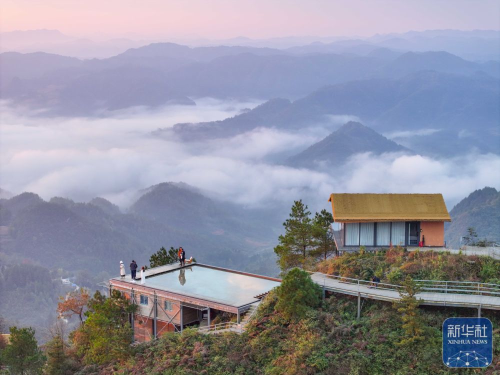 ↑ 11月15日,游人在贵州省开阳县高寨苗族布依族乡牌坊村欣赏晨景(无人机照片)。新华社发(袁福洪摄)
