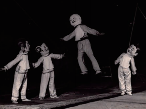 1958年,李春来头戴“大头佛”在软钢丝上表演。