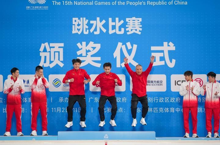 ↑11月7日,获得冠军的陕西队组合白钰鸣/杨昊与教练在颁奖仪式上跳上领奖台。新华社记者 薛宇舸 摄