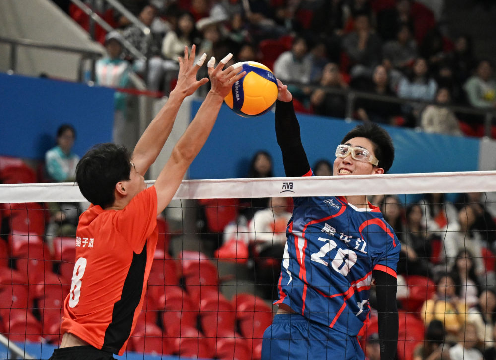 ↑11月14日,黑龙江队球员赵子淳(右)在比赛中扣球。新华社记者 周牧 摄