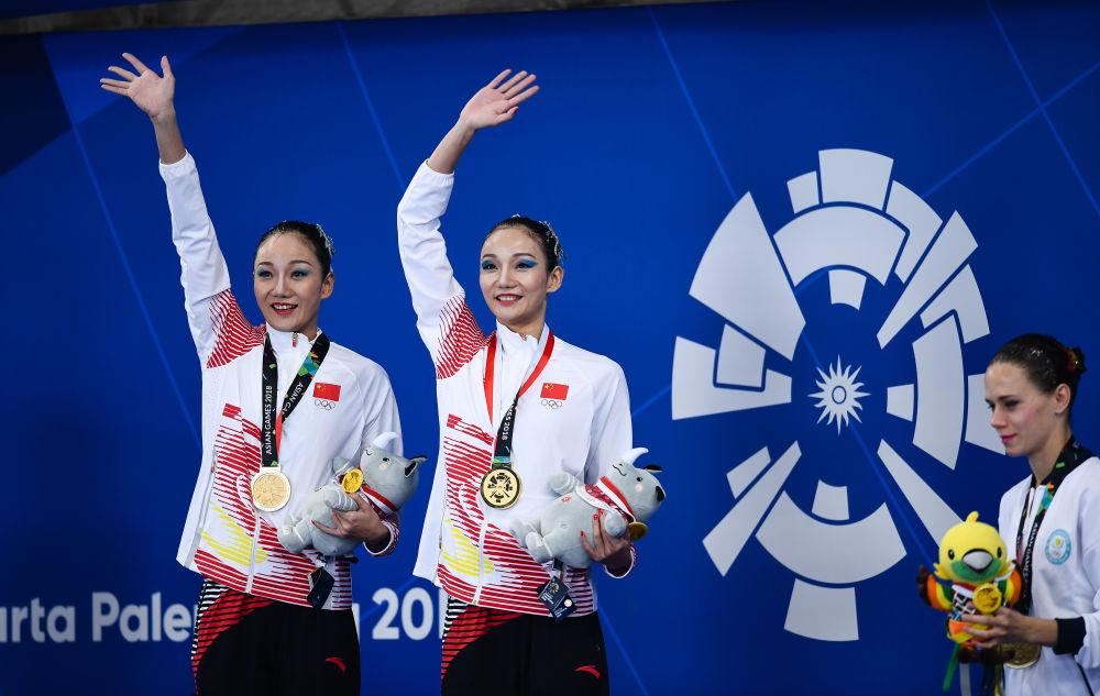 ↑2018年8月28日,中国组合蒋文文(右)、蒋婷婷在第18届亚运会花样游泳女子双人决赛中夺冠。新华社记者 李响 摄