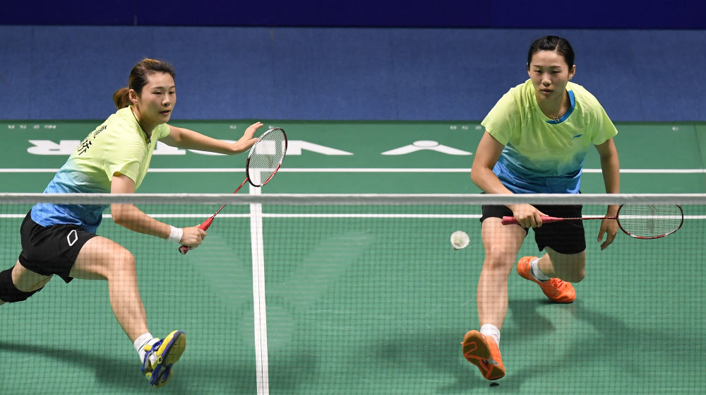 ↑2017年9月8日,骆赢(左)/骆羽在第十三届全运会羽毛球项目女子双打决赛中。新华社记者 许畅 摄