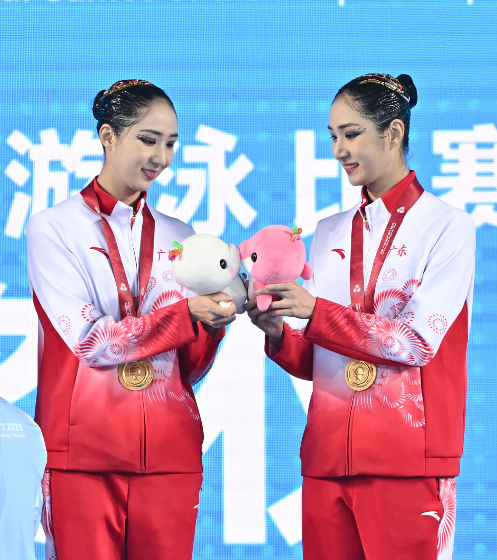 ↑11月15日,获得花样游泳女子双人项目冠军的广东队组合王柳懿/王芊懿在领奖台上与吉祥物互动。新华社记者 李鑫 摄