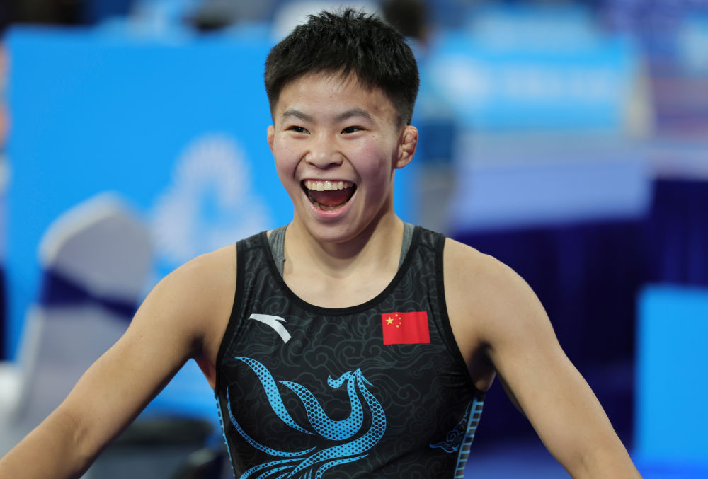 ↑11月10日,江苏队选手张玉在比赛后庆祝。新华社记者 李然 摄