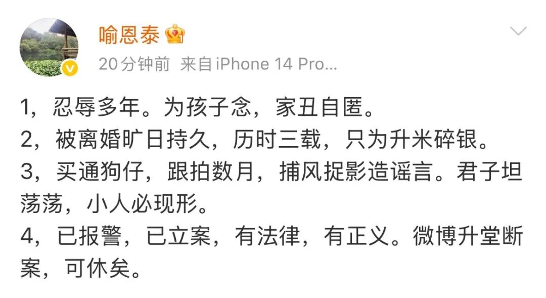 喻恩泰回应婚变风波:为孩子忍辱多年,已报警