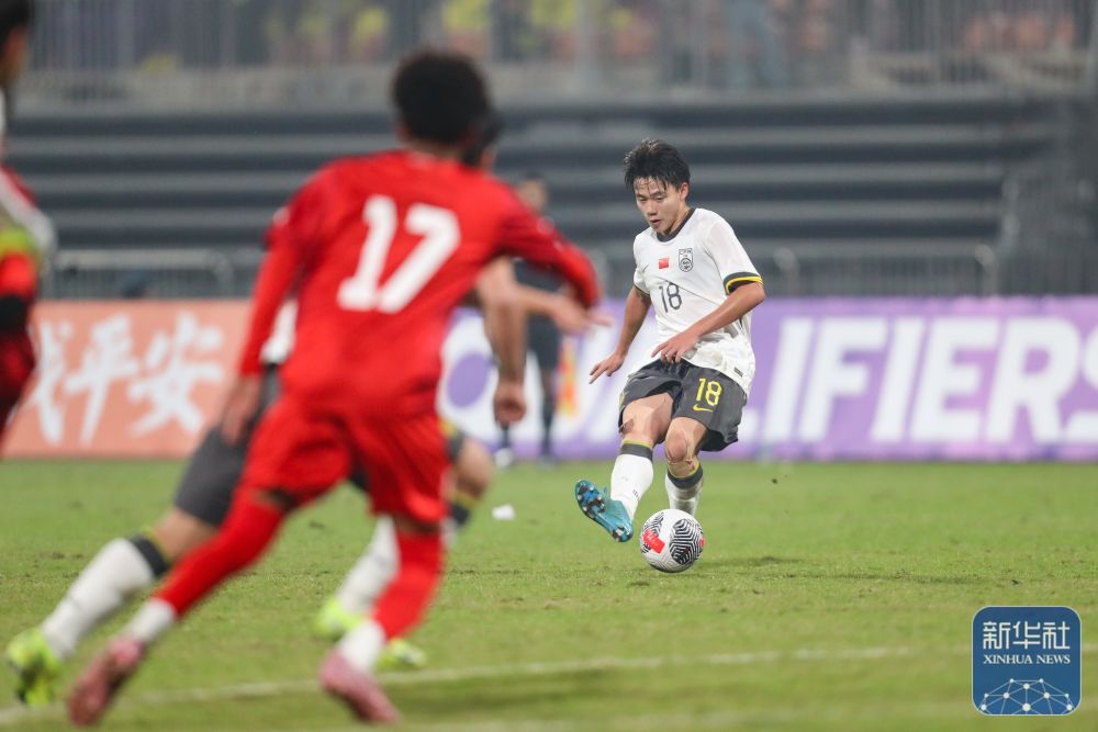 ↑ 中国队球员谢晋(中)在比赛中射门。