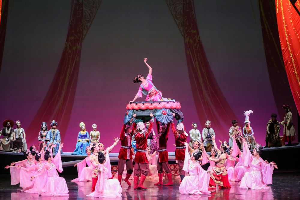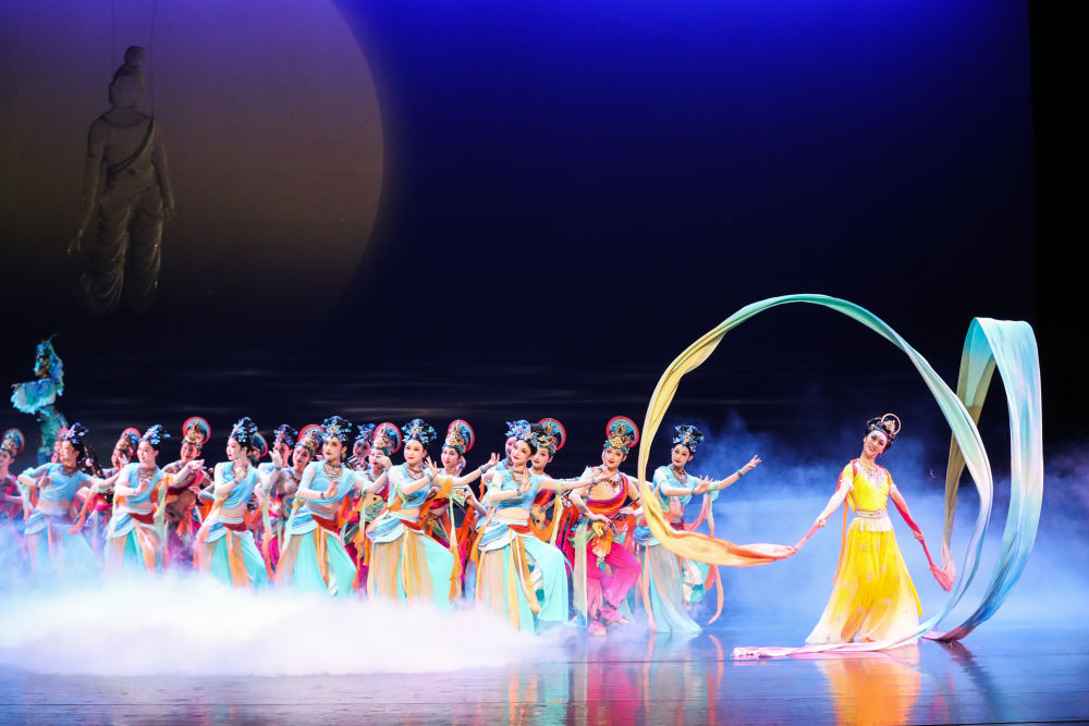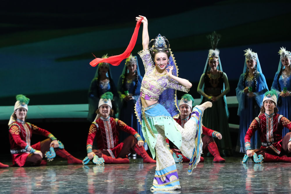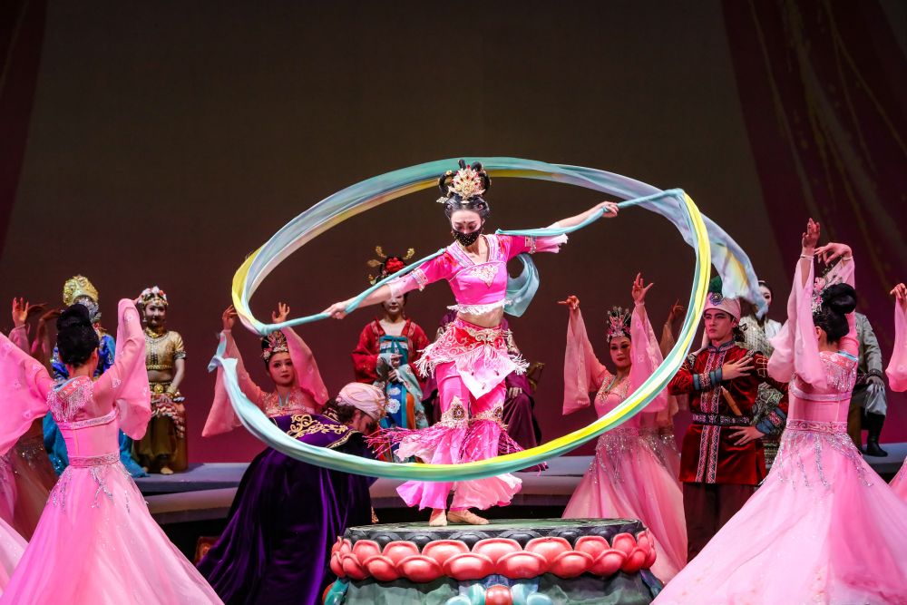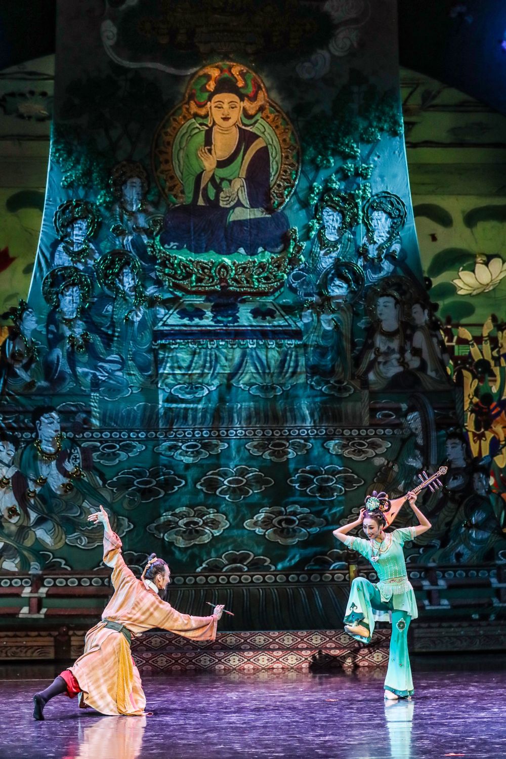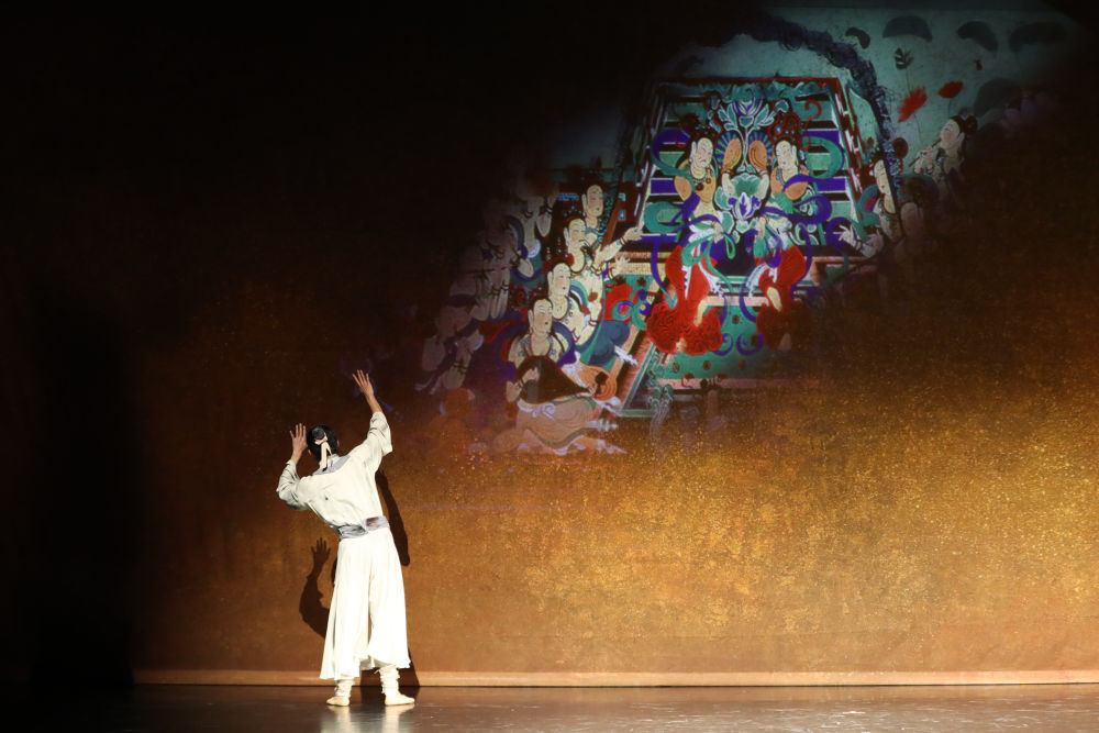 ↑11月28日晚,演员在甘肃大剧院表演2025年新版舞剧《丝路花雨》。