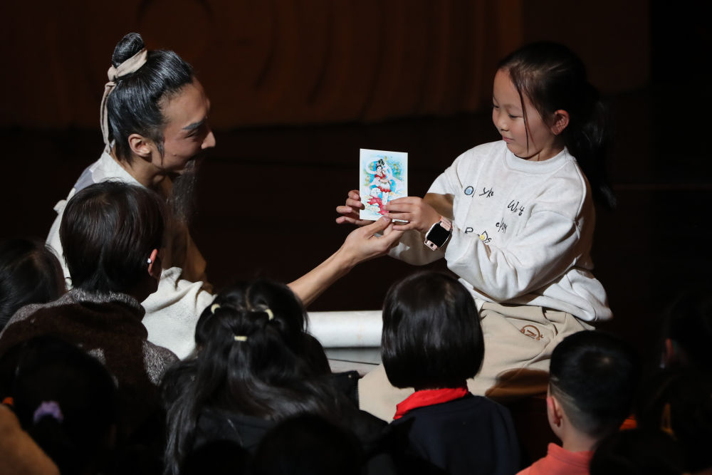 ↑11月28日晚,演员在中场休息间隙与台下观众互动并赠送《丝路花雨》明信片。