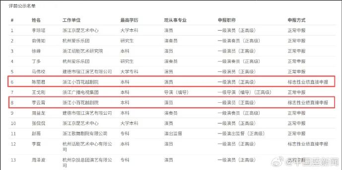 近日,据浙江省专业技术职务任职资格申报与评审管理服务平台,浙江小百花越剧院演员陈丽君和李云霄以标志性业绩直接申报一级演员,现已进入公示期。