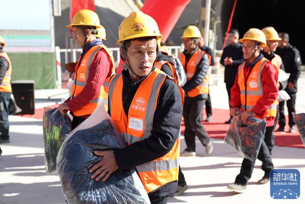 ↑ 12月2日,参与隧道建设的中铁二十局建设者在施工一线领取到御寒保暖的棉服。