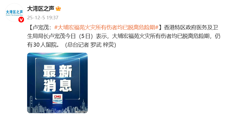 @大湾区之声:香港特区政府医务及卫生局局长卢宠茂今日(5日)表示,大埔宏福苑火灾所有伤者均已脱离危险期,仍有30人留院。