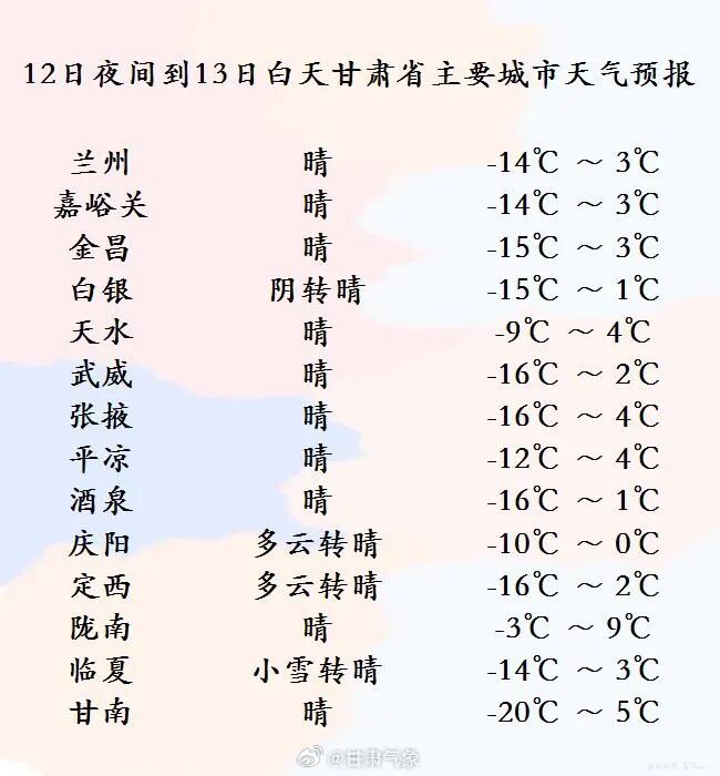 12日,受强冷空气影响,甘肃大部有降雪,气温继续下降,河西五市及白银、平凉、庆阳、甘南等市州有5-6级西北风,阵风8-9级,局部地方伴有短时沙尘天气。13-14日,全省大部晴或多云。