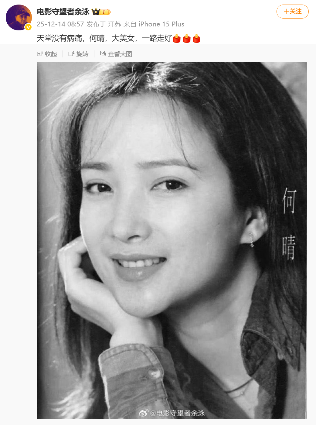 “电影守望者余泳”向记者证实了这一消息,他于社交平台发布何晴的黑白肖像照,并配文“天堂没有病痛,何晴,大美女,一路走好”,引发网友与演艺圈人士的集体缅怀。余泳透露,何晴生病后一直希望低调,让大家永远记住她美好的形象。据余泳微博认证消息,他是南京艺术学院口述历史研究中心特聘研究员。