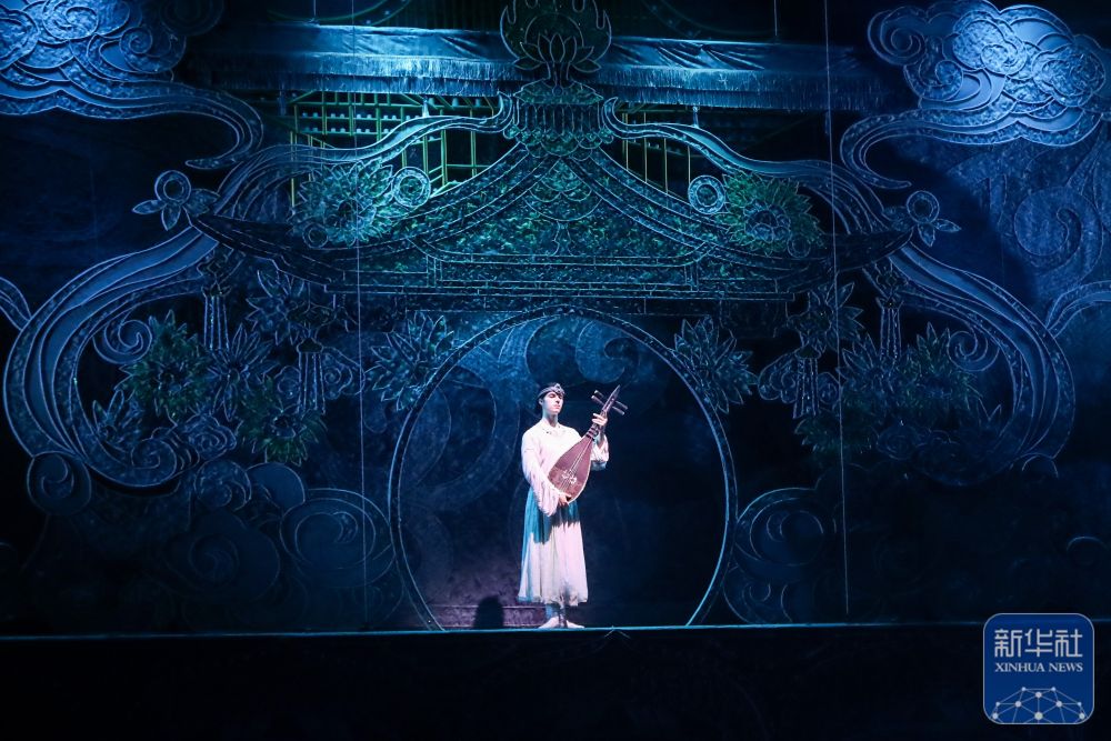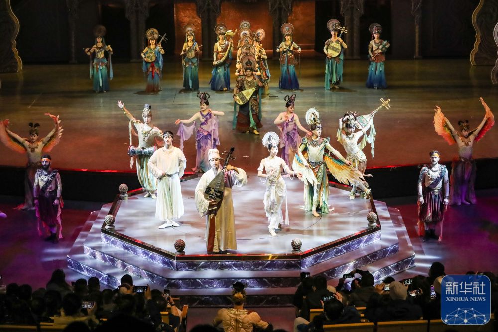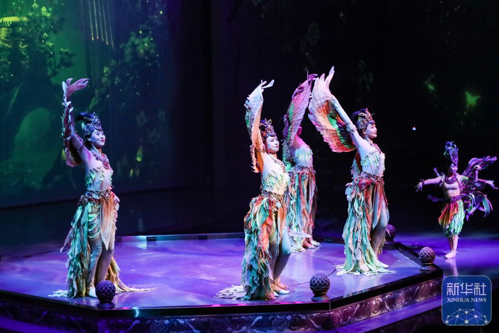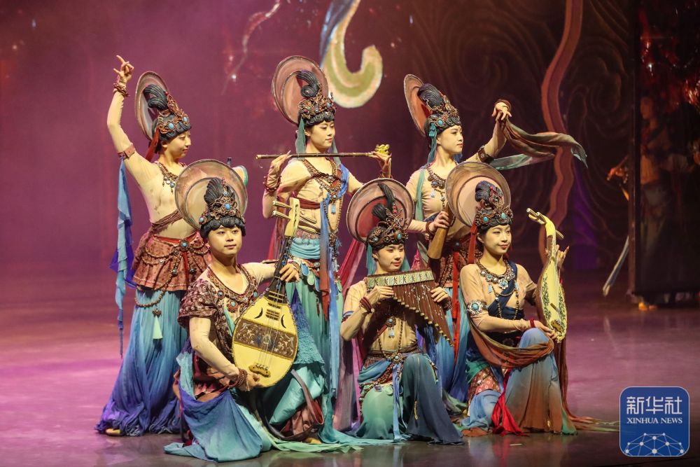 《乐动敦煌》通过全息投影等数字技术、美轮美奂的舞台美术设计以及演员的精彩表演,生动还原了莫高窟壁画中“伎乐飞天”等经典乐舞场景。新华社记者 郎兵兵 摄影报道