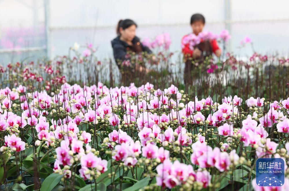 ↑ 12月17日,工作人员在河北省石家庄市藁城区廉州镇一家花卉种植基地养护蝴蝶兰花卉。新华社发(梁子栋摄)