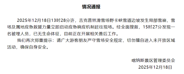 2025年12月18日13时28分许,吉克普林滑雪场野卡峡雪道边坡发生局部雪崩,雪场及属地应急救援力量立即启动应急响应机制赶往现场。经全面搜救,15时27分发现一名被埋人员,已无生命体征,目前正在开展相关善后工作。