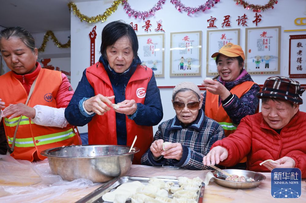 ↑ 12月18日,在江苏省兴化市临城街道赵何村颐养中心,志愿者和老人们一起包饺子、搓圆子。新华社发(史道智摄)