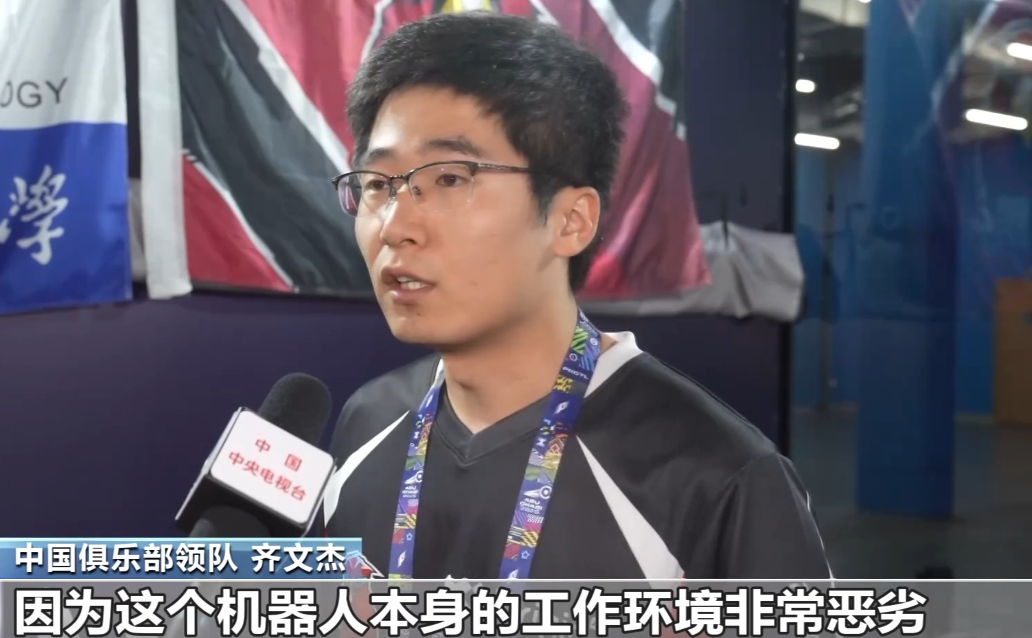 中国俱乐部领队 齐文杰:因为这个机器人本身的工作环境非常恶劣,所以它在对抗的过程中,很有可能某一部分发生损伤。把内部的单元做成模块化之后,能极大提高我们更换内部零件的速度。