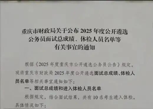 当天,重庆市财政局人事教育处出具的《关于公布2025年度公开遴选公务员面试总成绩、体检人员名单等有关事宜的通知》称,根据相关规定,结合面试结果,共有10名考生进入体检。