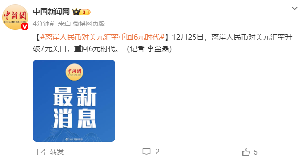 据中国新闻网,12月25日,离岸人民币对美元汇率升破7元关口,重回6元时代。