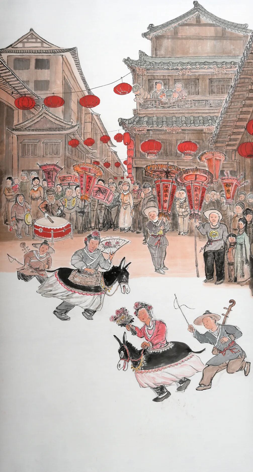 在他的画卷里,没有刻意塑造的“艺术形象”,只有一个个鲜活的普通人:《古郡雄风闹春潮》中,追着舞狮队伍奔跑的孩童,手里攥着糖葫芦,脸上满是雀跃;《锣鼓催开太平调》里,坐在石墩上看表演的老者,嘴角带着笑意,眼神里满是怀念;《琴瑟相续意绵绵》中,围观骑驴表演的村民,有的拍手叫好,有的低声说笑,这些充满烟火气的细节,让画卷跳出了“艺术品”的高冷框架,变得亲切可感。梁宗文在创作中曾说:“我画的不是名人雅士,是我挚爱的乡亲们,他们的笑容、他们的快乐,才是最动人的艺术啊!”