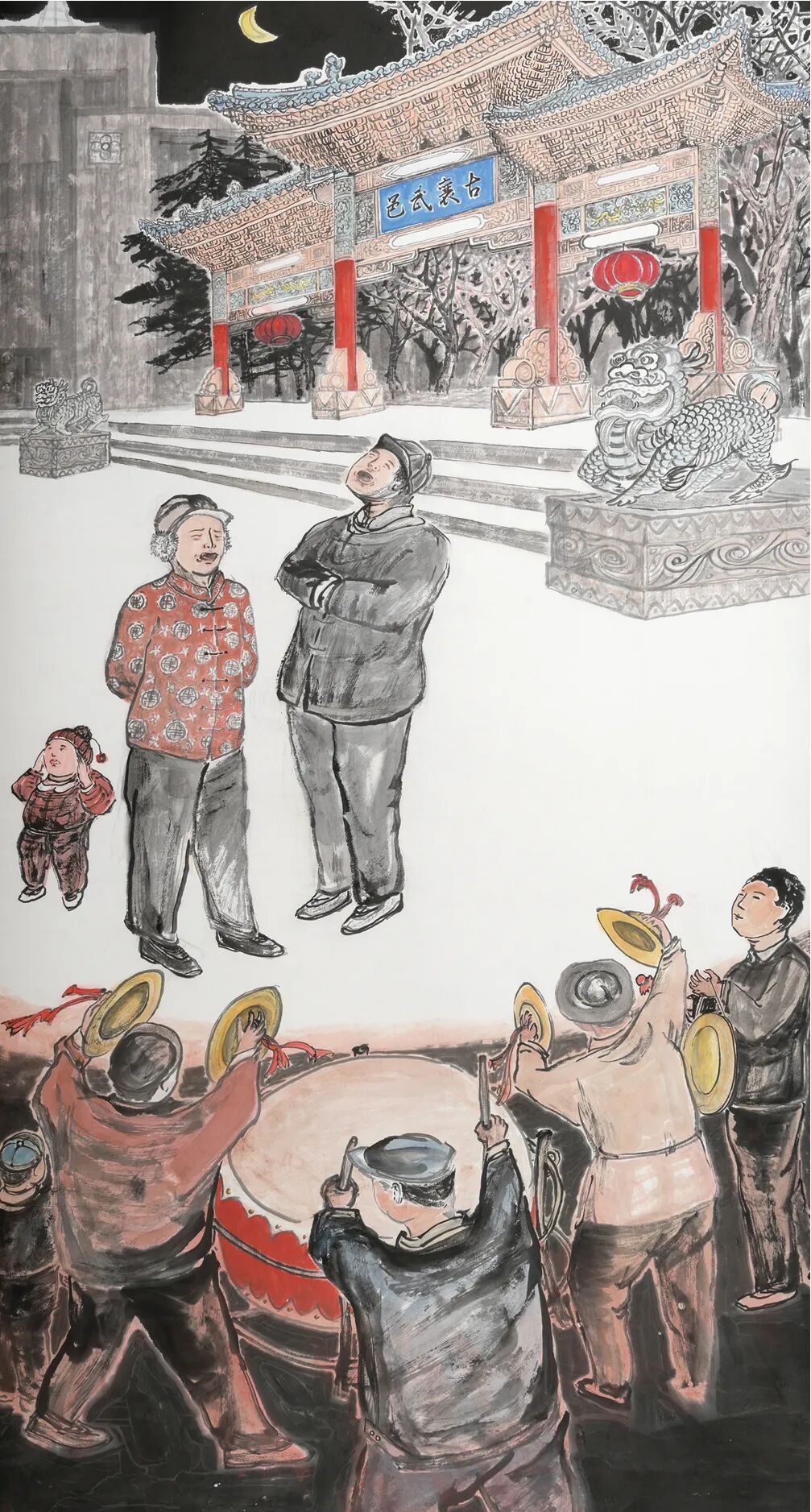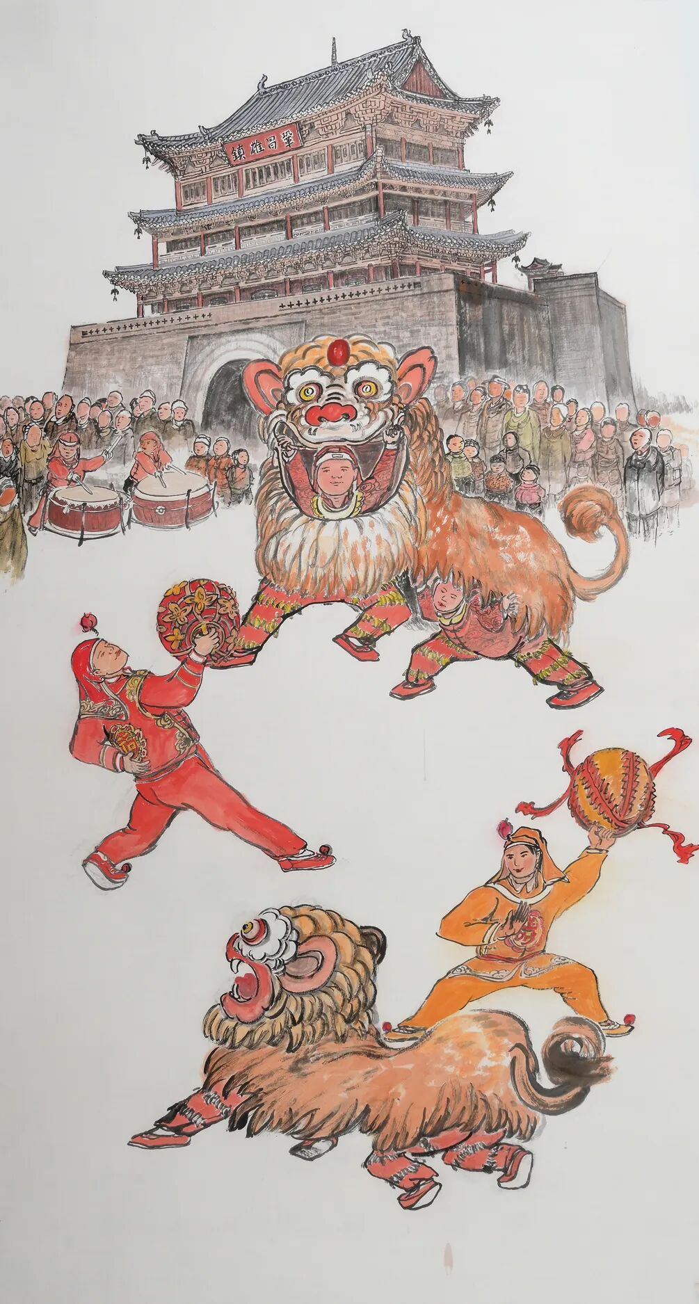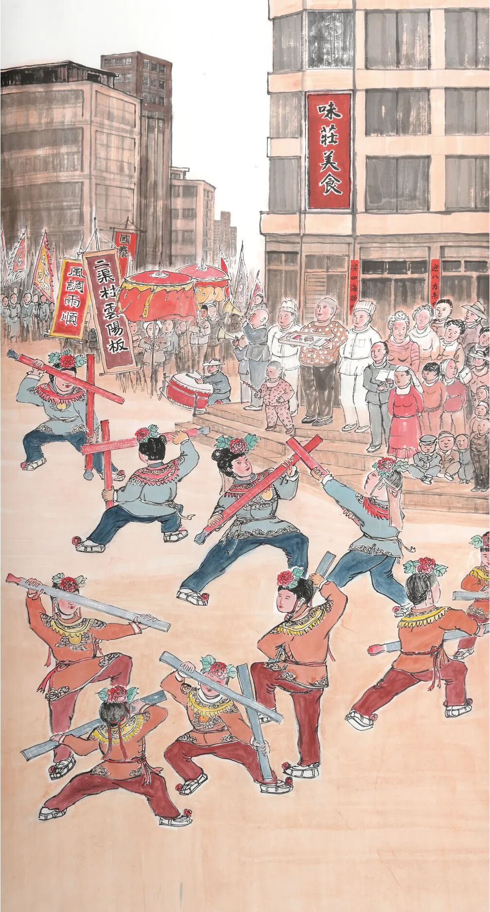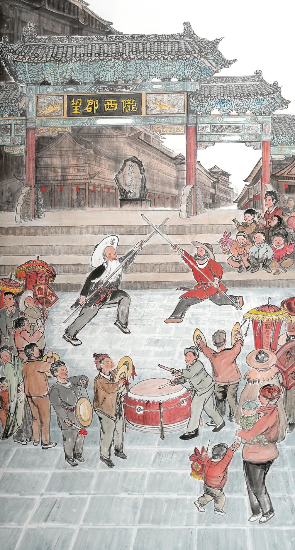 更难得的是,梁宗文在刻画民俗场景时,始终注重挖掘其背后的文化内涵。在陇西,舞龙不仅是春节的娱乐活动,更承载着百姓对风调雨顺的祈愿——龙身的长度、舞龙的路线,都与当地的民俗传承、农耕文化息息相关。在《天门不碍蛟龙跃》中,他将舞龙队伍置于陇西的古老牌坊头天门下,龙身从门洞蜿蜒而出,龙头向着天空昂首,仿佛要冲破云霄;画中的龙鳞以焦墨点描,龙爪则用劲健的线条勾勒,既展现了舞龙的磅礴气势,也暗合了陇西百姓对“龙行雨施”的美好期盼。而《锣鼓催开太平调》里的民间传统秧歌铙子表演,更是陇西民俗中“祈福纳祥”的重要载体:画面中,鼓手们围坐成圈,鼓槌落下时尘土飞扬,围观的百姓拍手叫好,梁宗文用粗犷的线条描绘鼓面的震动,用晕染的墨色表现鼓声的回荡,让观者仿佛能听见那穿越街巷的锣鼓声,也能感受到百姓对“太平盛世”的朴素向往。