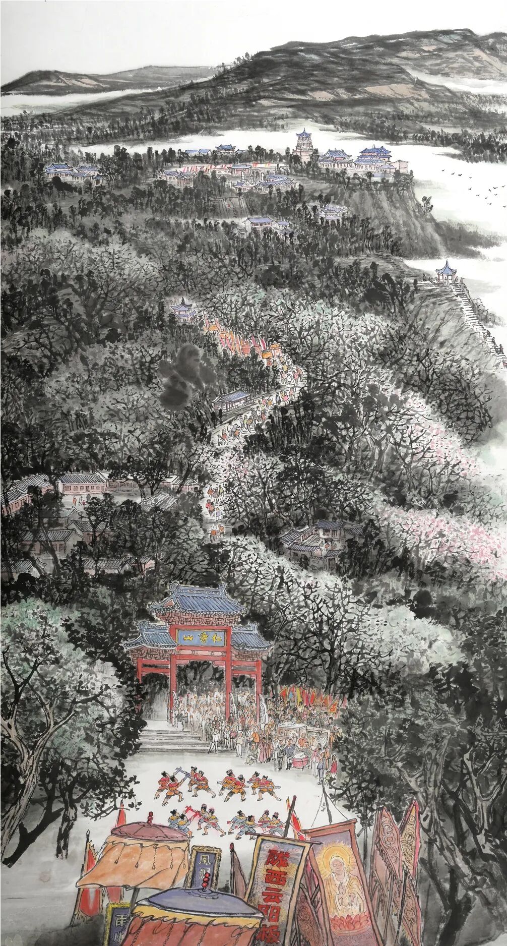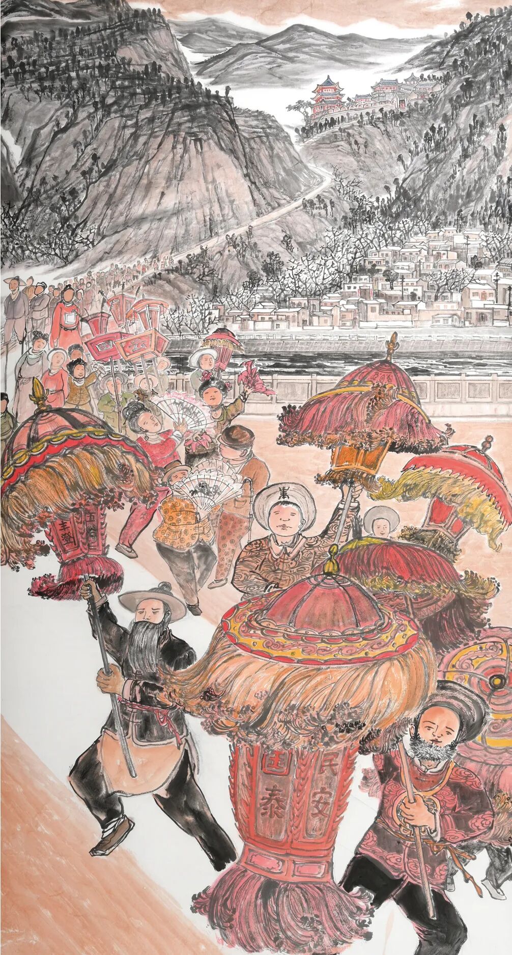 在色彩运用上,梁宗文秉持“墨为主,色为辅”的中国画传统,同时融入了陇西本土的色彩审美。陇西地处黄土高原,百姓的生活中多以红、黄、黑等色彩为主,这些颜色也成为他作品中的主色调:舞龙的红绸、社火的黄旗、艺人的黑衫,在水墨的底色上格外醒目,既还原了民俗场景的真实样貌,又让画面充满了浓郁的乡土气息。《纳祥接福祈精进》中,社火队伍的旗幡以朱砂点染,在黑白的画面中形成视觉焦点,而背景的黄土墙则用淡赭石晕染,与旗幡的红色相互映衬,仿佛能让人感受到黄土高原上的阳光与风沙。这种色彩搭配,既符合中国画“计白当黑”的审美原则,又彰显了陇西地域文化的独特魅力。