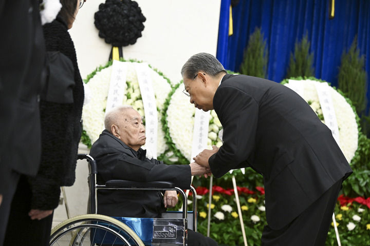 12月26日,彭珮云同志遗体在北京八宝山革命公墓火化。受中共中央委托,赵乐际、蔡奇、丁薛祥、韩正等到八宝山革命公墓为彭珮云同志送别,并慰问其亲属。这是赵乐际与彭珮云亲属握手,表示慰问。新华社记者 燕雁 摄
