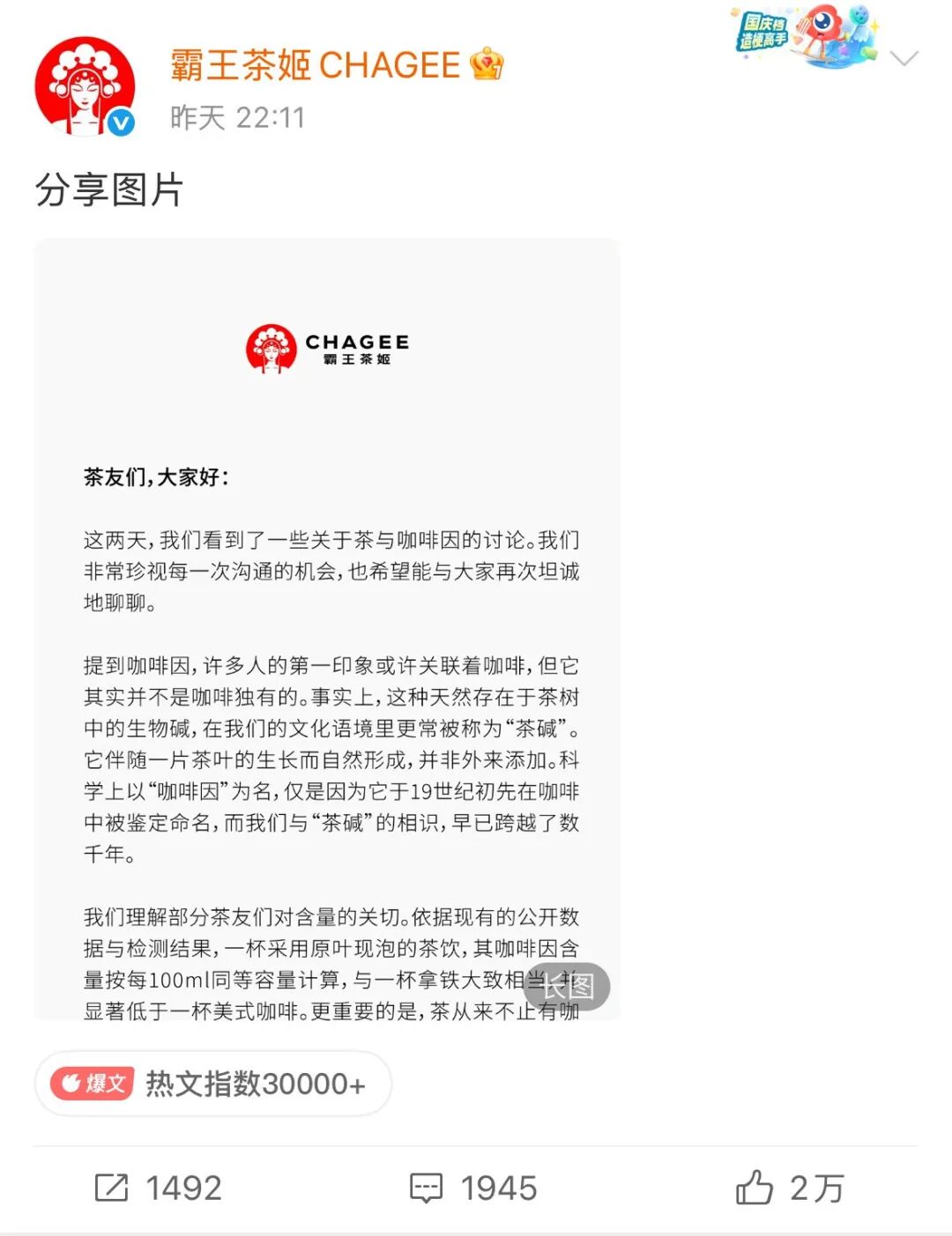 霸王茶姬深夜发文回应咖啡因争议。