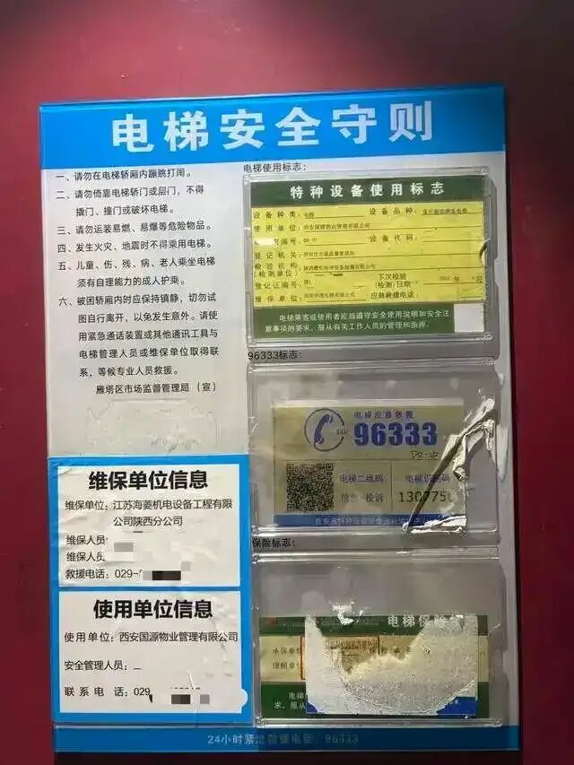 另外两部电梯内的标识信息显示,该电梯属于曳引驱动乘客电梯,使用单位为西安国源物业管理有限公司,维保单位在不同位置分别写有两家公司:西安华茂电梯有限公司、江苏海菱机电设备工程有限公司陕西分公司。信息标牌显示,该电梯下次检验日期为2026年4月。