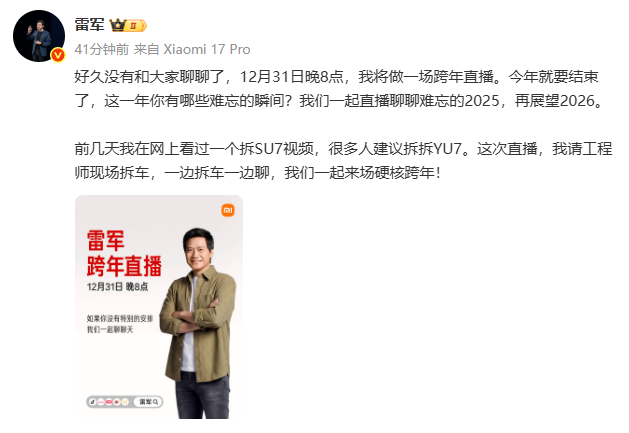 雷军今日午间在其个人微博表示,“前几天我在网上看过一个拆SU7视频,很多人建议拆拆YU7。这次直播,我请工程师现场拆车,一边拆车一边聊。”