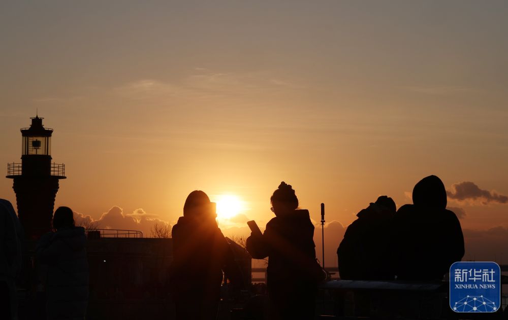 ↑ 2026年1月1日,游客在大连星海广场海边观看日出。新华社记者 李钢 摄