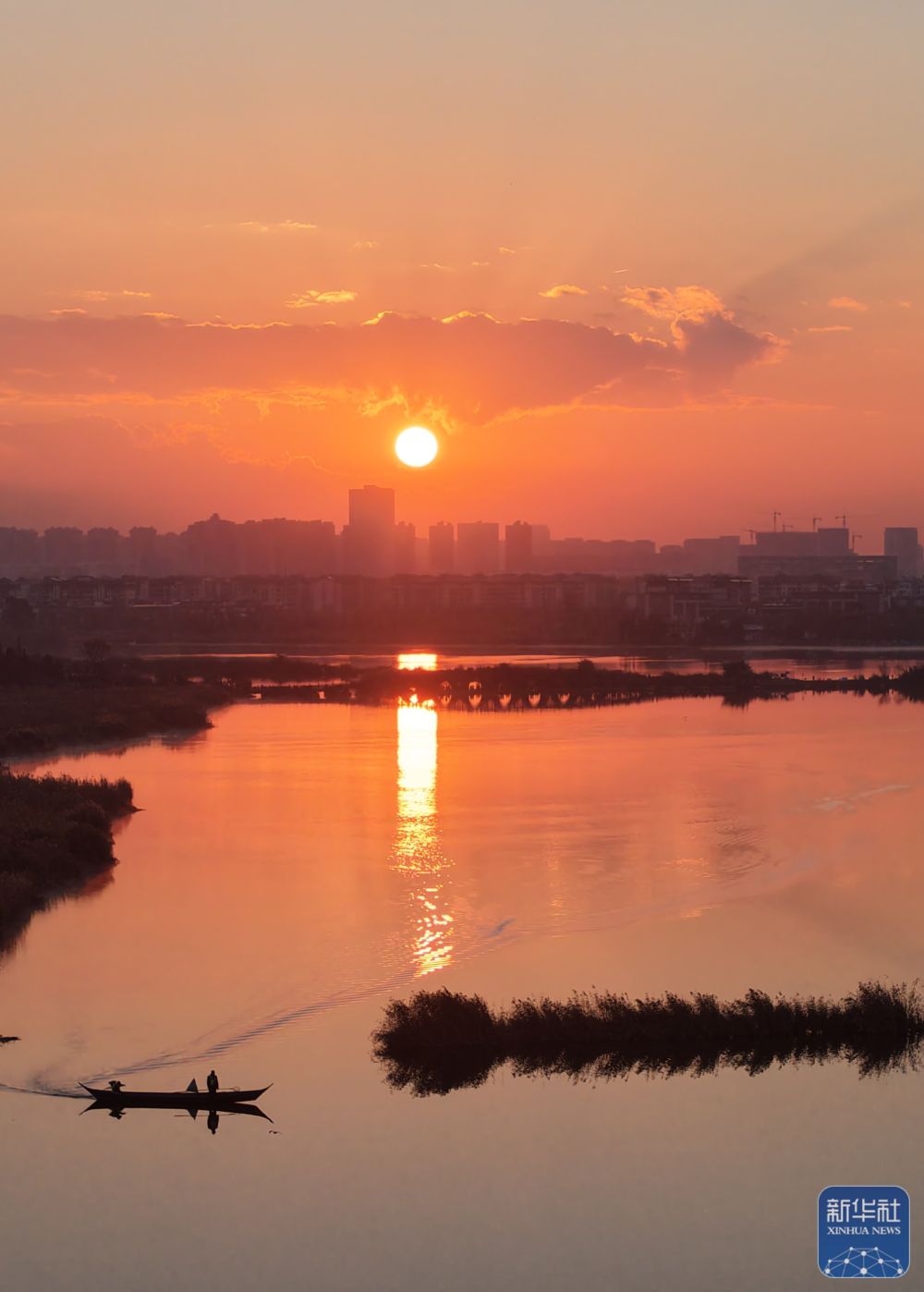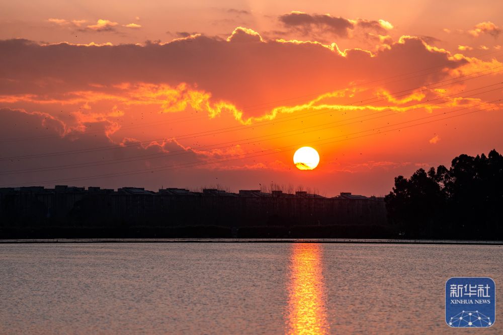 ↑ 2026年1月1日在云南省昆明市干沟尾湿地公园拍摄的日出(无人机照片)。新华社发(梁志强摄)