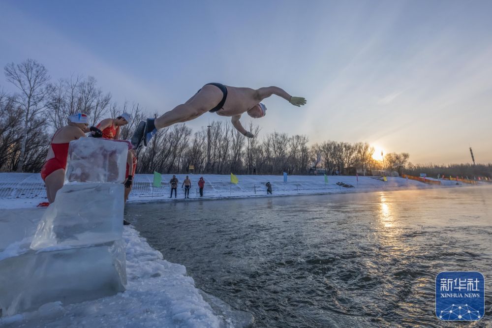 ↑ 2026年1月1日清晨,冬泳爱好者在黑龙江省齐齐哈尔市嫩江冬泳基地冬泳。新华社发(王勇刚 摄)