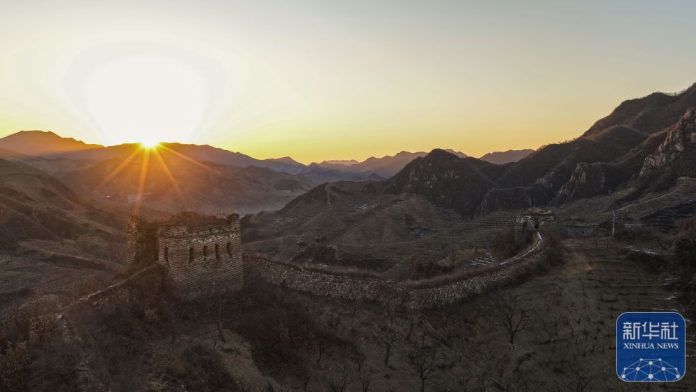 ↑ 2026年1月1日在河北省迁西县金厂峪镇拍摄的朝阳下的榆木岭长城(无人机照片)。新华社发(刘满仓 摄)