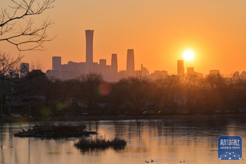 ↑ 2026年1月1日在北京拍摄的城市建筑和初升的朝阳。新华社记者 孙瑞博 摄