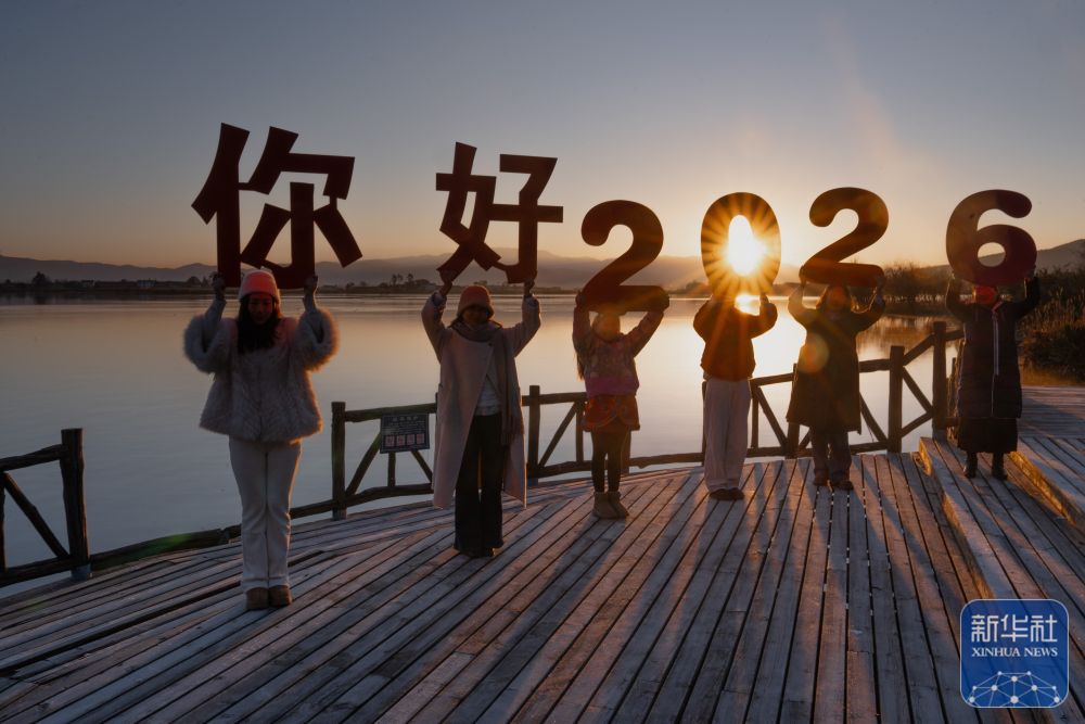 ↑ 2026年1月1日,人们在云南省大理白族自治州洱源县西湖观景台迎接新年日出。新华社发(罗新才摄)