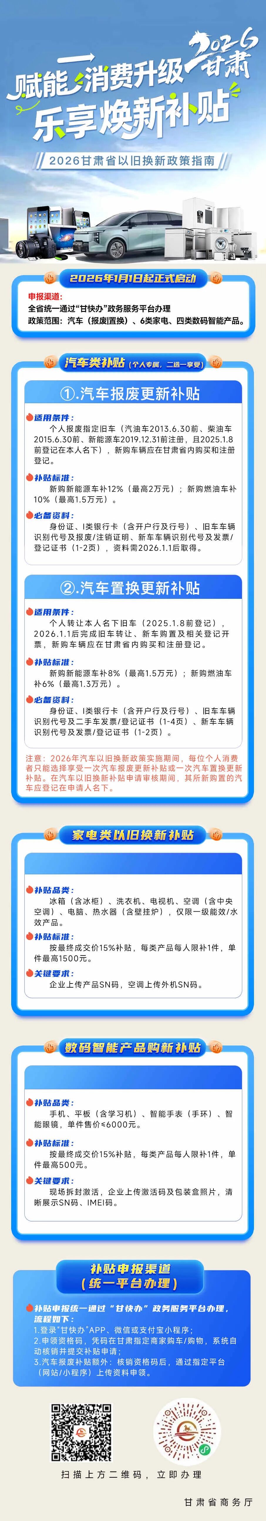 据甘肃省商务厅消息,1月1日起,甘肃2026消费品以旧换新补贴政策正式实施。汽车类最高补2万元;家电类享受15%补贴,单件最高补贴1500元;数码类享受15%补贴,单件最高补贴500元。